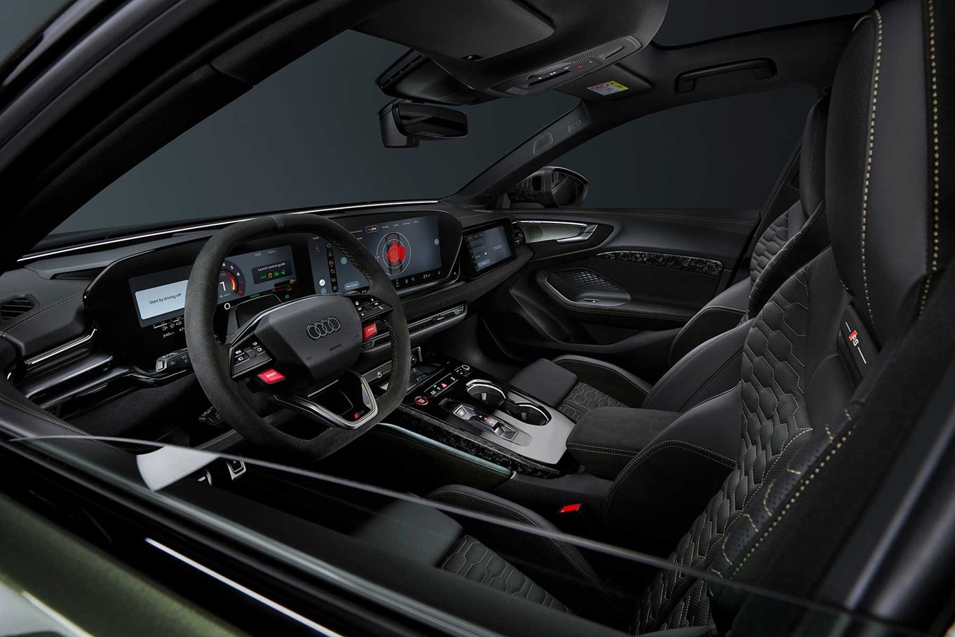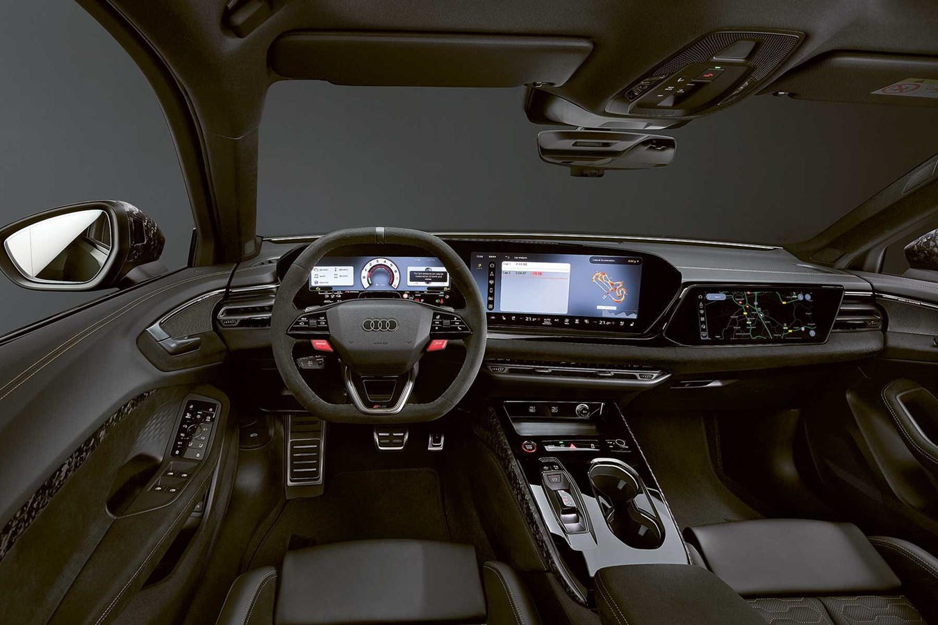 Unutrašnjost je obogaćena detaljima specifičnim za RS 5, poput volana s oznakom na 12 sati, mnoštvom karbonskih ukrasa, crvenim šavovima i raznim grafikama i amblemima. Uz to, i dalje se uvelike temelji na Audijevoj unutrašnjosti Digital Stage koja je osnova obitelji A5, koju će neki voljeti zbog njezine tehnološki napredne prirode, dok će drugi vjerojatno žaliti zbog nedostatka određenih ključnih fizičkih prekidača - poput kontrole klime, koja je sada sva na središnjem ekranu osjetljivom na dodir.