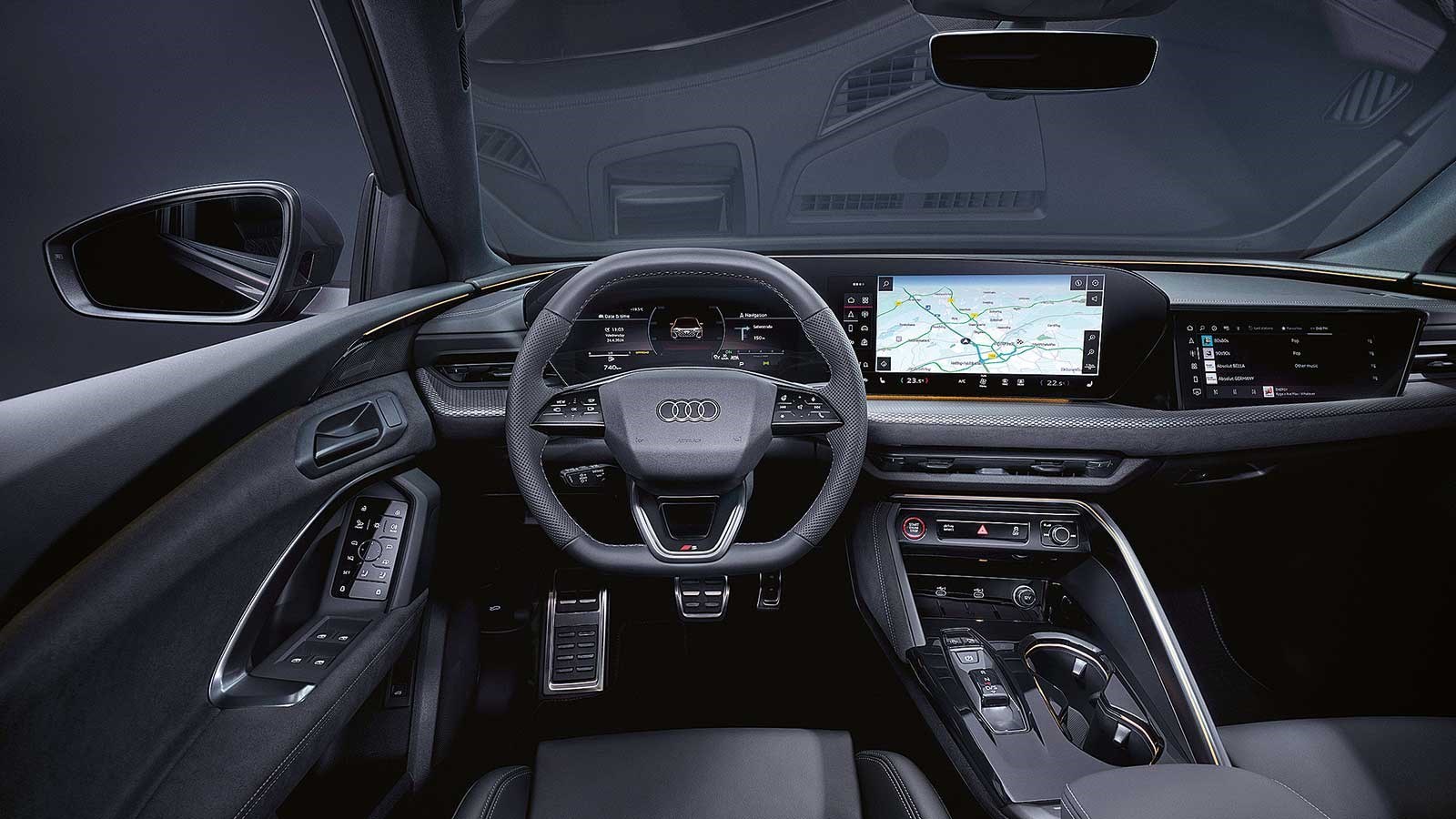 Unutrašnjost podsjeća na novi A5, pa tako niti ovdje ekrana ne nedostaje. Vozač je okružen panoramskim zakrivljenim ekranom koji se u stvarnosti sastoji od 11,9-inčnog ekrana iza volana i središnjeg ekrana infotainmenta od 14,5 inča. Ispred suvozača još je jedan ekran od 10,9 inča koji vozač ne može vidjeti, ali on je na popisu opcija.